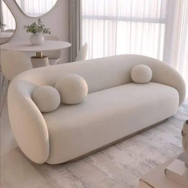 This avant-garde sofa redefines modern living. With its seamless, rounded edges and low-profile design, it brings an organic, sculptural element to your space. The plush cream fabric is soft to the touch, and the unique ball-shaped pillows provide both comfort and a high-fashion decorative touch.