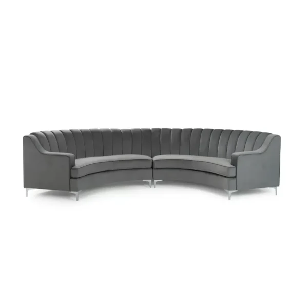 Break away from straight lines with this stunning curved sectional sofa. The C-shape design encourages conversation, while the silver-grey velvet and vertical tufting provide a glamorous, boutique-hotel feel. It is the perfect centerpiece for a large, modern open-concept living area.
