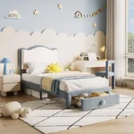 This Modern Slate Blue Bed offers a clean, sophisticated look for a boy’s bedroom. The two-tone upholstered headboard provides a comfortable backrest for reading, while the discreet under-bed drawer offers a smart solution for storing extra bedding or toys without cluttering the floor.