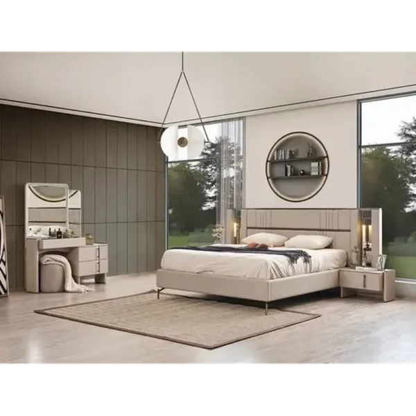 A sleek, all-in-one solution for the modern bedroom. This Turkish bed features plush grey velvet, vertical stitching for height, and integrated nightstands that create a unified, high-end hotel aesthetic.