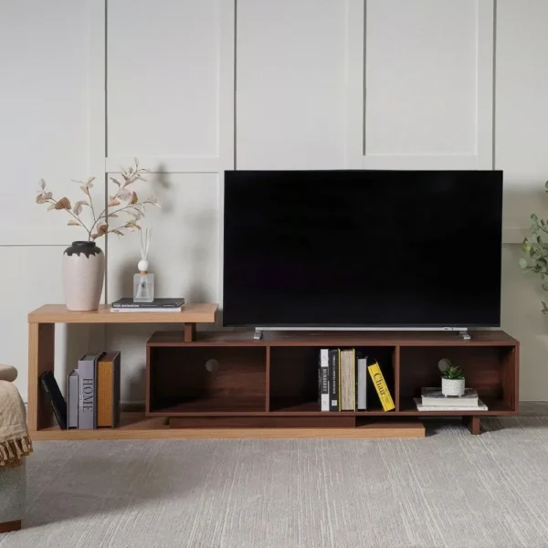 This versatile TV stand offers a contemporary twist on media storage. The dual-tone design features a natural oak upper ledge paired with a dark brown base. Three open compartments provide plenty of space for gaming consoles, books, and soundbars, while the wide surface area easily accommodates large flat-screen TVs.