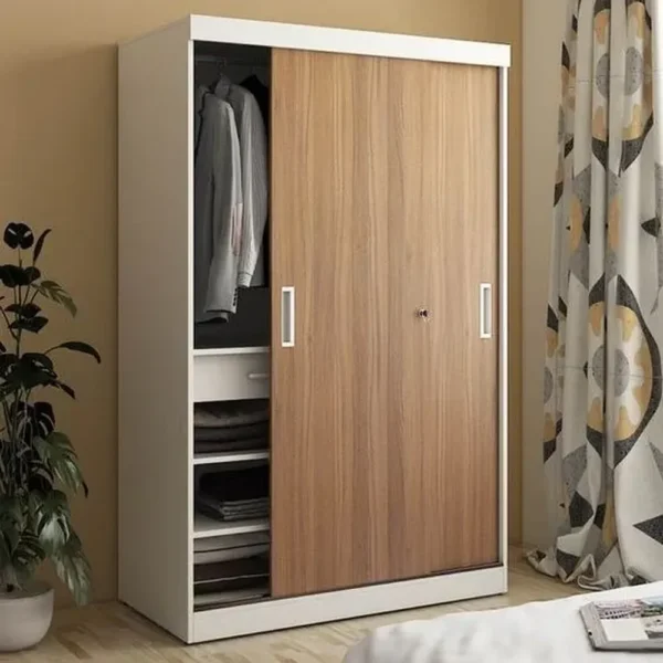 This functional and stylish cupboard is designed for the modern home. The dual-tone finish of crisp white and warm oak creates a neutral look that fits any bedroom decor. The sliding mechanism is smooth and quiet, concealing a well-organized interior with multiple compartments for clothing and accessories.