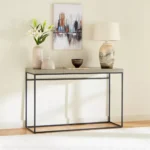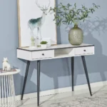 Bring a touch of mid-century modern style to your entryway with this chic console table. The white deco top provides a bright surface for decor, while the two drawers and open shelf offer practical storage. Its slender black legs provide a high-contrast, airy look.