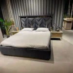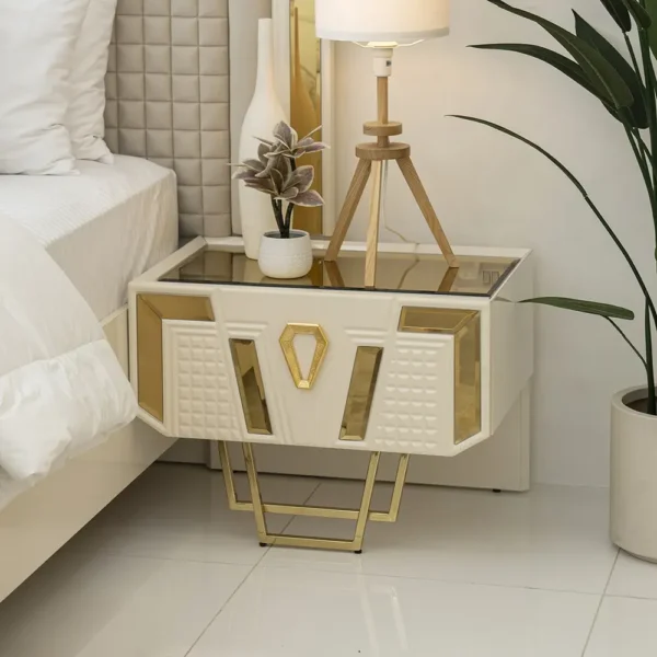 A statement of pure luxury, this white and gold bed features a striking geometric headboard with reflective gold inserts. The soft velvet texture and metallic highlights bring a glamorous Turkish flair to any master suite.