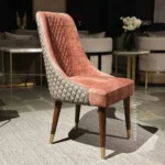 A masterpiece of dining luxury, this chair features a striking contrast between soft rust-colored velvet and a grey quilted leather-rite exterior. The diamond stitching on the back adds a layer of sophistication, supported by dark wooden legs with gold-tipped accents for a truly Turkish-inspired modern look.