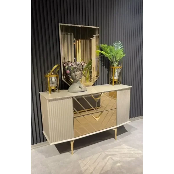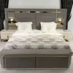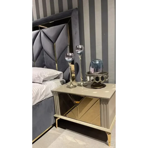 Redefine elegance with this Turkish-inspired velvet bed. The striking black headboard features a unique chevron pattern separated by sleek gold metallic inlays. This set creates a bold, luxurious atmosphere that transforms any bedroom into a high-end suite.