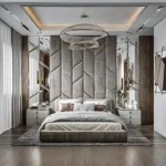 - Full-wall upholstered panel design