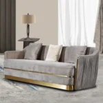 This Turkish-inspired sofa blends royal comfort with modern glam. Featuring soft velvet fabric and striking gold trim along the base and armrests, the sofa includes vertical channel tufting and high-density foam for a premium lounging experience.