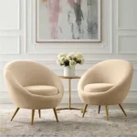 Add a touch of luxury to your dressing area or bedroom with these classic beige velvet chairs. The curved, cocoon-like shape provides exceptional comfort, while the gold-finished legs offer a high-end, glamorous aesthetic.