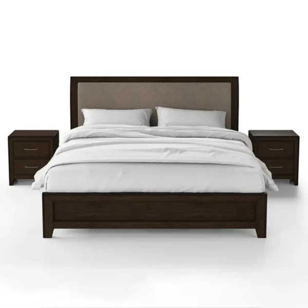 This bed offers a refined, simple aesthetic for the modern home. The dark brown wood frame provides a sharp contrast to the soft beige jute fabric inset on the headboard. It is a perfect choice for those who appreciate clean lines, natural textures, and a clutter-free environment.