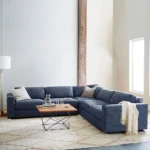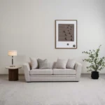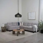 Designed for comfort and durability, this L-shaped sofa is upholstered in a resilient grey jute fabric. The tufted backrest provides a soft, structured feel, making it ideal for family lounging. Its neutral tone and simple silhouette allow it to blend seamlessly into any living room decor.