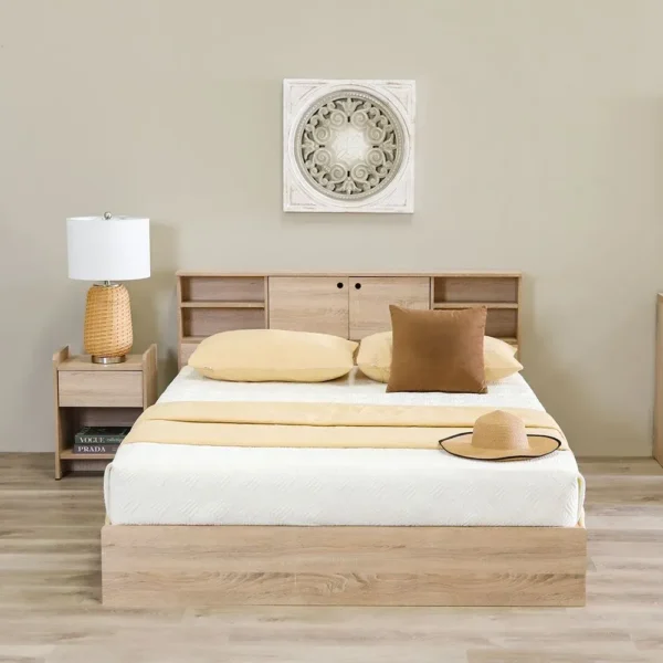 Perfect for compact living, this laminated bed in a light brown oak finish offers both style and functionality. The headboard includes built-in open shelving and cabinets to keep your essentials within reach. Its clean lines and simple silhouette suit any modern interior.