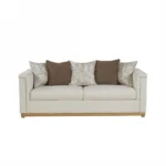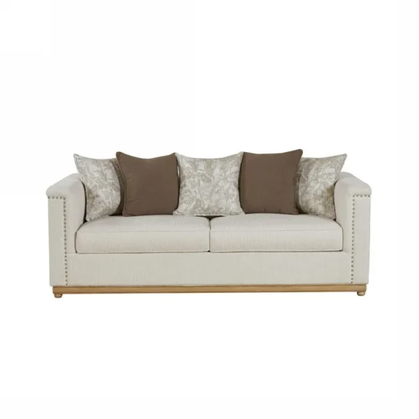 This sophisticated two-seater sofa is upholstered in a clean off-white fabric. It features classic silver studding along the arms and a beautiful light wood base. The plush back pillows offer exceptional comfort while maintaining a simple, refined aesthetic for your living room.
