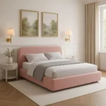 This bed brings a soft, calming aesthetic to the bedroom. Upholstered in a delicate pink velvet, the frame features a seamless, rounded look that is both modern and inviting. The minimalist design is perfect for creating a serene environment, while the high-quality fabric ensures long-lasting comfort and style.
