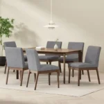 This 6-seater dining set brings warmth and simplicity to the home. The rich brown wooden table is paired with comfortable grey jute upholstered chairs, creating a balanced, Scandinavian-inspired look that is perfect for family meals.