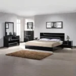 Embrace contemporary luxury with this high-gloss black bedroom set. The sleek deco finish is punctuated by sharp, silver geometric lines that catch the light, creating a bold, masculine, and ultra-modern atmosphere.