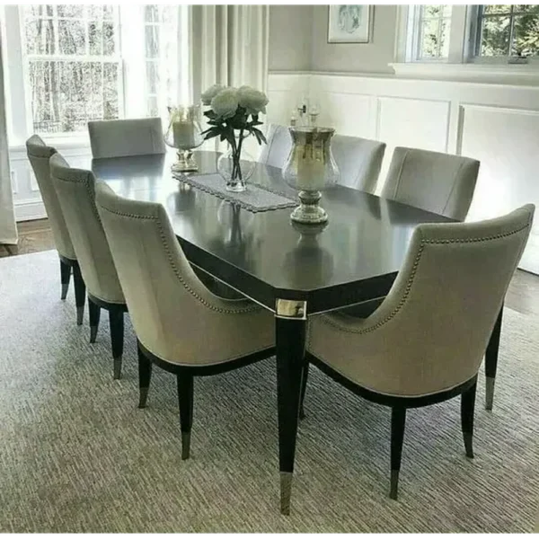 This formal dining set is designed for hosting in style. The expansive black polished table is accented with silver hardware, perfectly complemented by eight high-back chairs upholstered in a refined grey fabric. The silver-tipped legs add a final touch of classic sophistication.