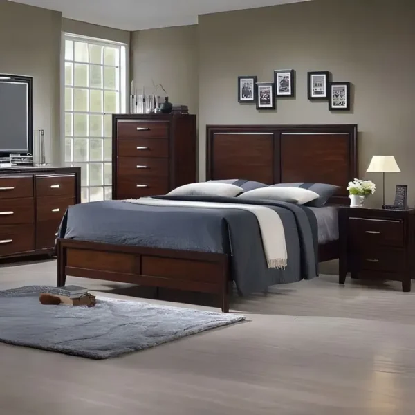 This comprehensive bedroom suite brings warmth and tradition to your home. The set includes a sturdy bed frame with a distinctive double-paneled headboard, complemented by a tall chest of drawers and a spacious dresser. Every piece is finished in a consistent dark brown polish, accented by modern silver hardware for a look that never goes out of style.