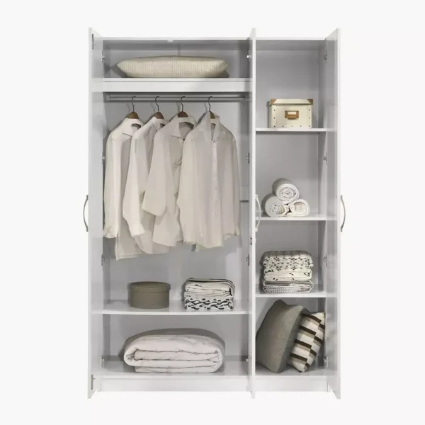 This versatile cupboard offers a clean, bright look for your bedroom. The triple-door design provides ample hanging and shelf space, while the central mirror adds utility and creates a sense of openness in your room.