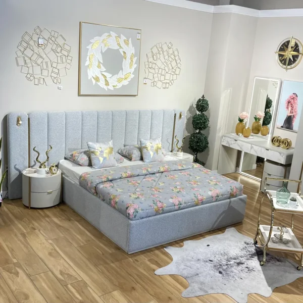 Turn your bedroom into a floral sanctuary with this grand Turkish fabric bed. The extra-wide headboard features vertical fluting and built-in gold lighting fixtures for a hotel-suite feel. The blue and white floral upholstery adds a soft, romantic touch to the sturdy, upholstered bed frame.