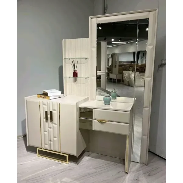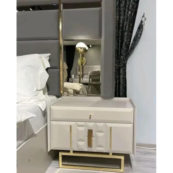 The ultimate in luxury, this Turkish bed set features a massive headboard with gold trim and integrated lighting. The set includes a matching wrap-around storage bench at the foot of the bed, all wrapped in premium grey velvet. It’s a statement piece designed for the most opulent of master suites.
