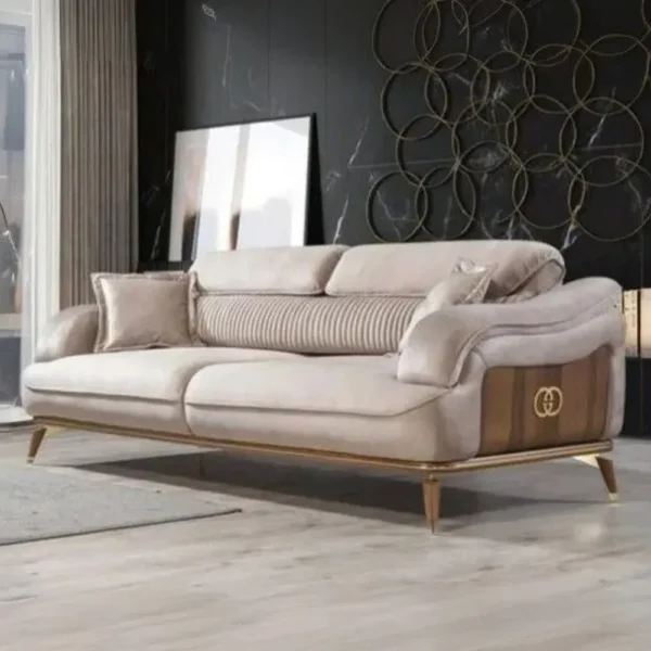 A masterpiece of Turkish design, this beige velvet sofa features a striking ribbed backrest and luxurious gold detailing. The side panels incorporate a warm wood finish with a signature emblem, supported by designer gold legs that define opulence and modern craftsmanship.