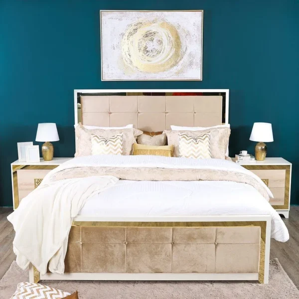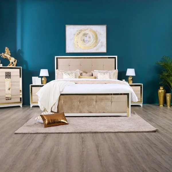 This Turkish-inspired fabric bed brings opulence to the bedroom. The headboard and footboard feature deep button tufting in beige velvet, framed by a crisp white deco border with shimmering gold trim. The matching side tables and tall dresser complete this high-end, regal look.