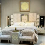 Experience the height of Turkish craftsmanship with this grand fabric-upholstered bed. The expansive headboard features plush vertical tufting and integrated side mirrors with shelving, creating a functional yet regal focal point. The jute fabric provides a durable, sophisticated texture for any upscale bedroom.