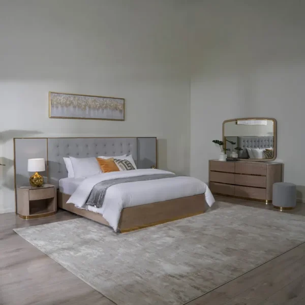 Elevate your sleeping space with this Turkish-inspired fabric bed. Wrapped in high-quality grey jute fabric, the headboard features classic tufting and is flanked by extended panels with elegant gold trim. The set is completed with matching bedside tables for a cohesive, high-end look.