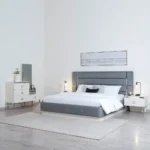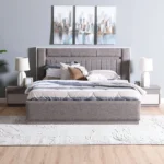 Bring a touch of Turkish elegance to your bedroom. This bed features a sophisticated grey jute fabric with a high-profile headboard divided into plush vertical segments. The seamless integration of the bed frame with matching low-profile side units provides a sleek, unified appearance.