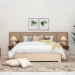 This Turkish-inspired master bed features an expansive upholstered headboard with built-in accent lighting and mirror inserts. The combination of crisp white leather rite and warm brown accents creates a sophisticated, multi-dimensional look. Crafted for those who desire a high-end, boutique hotel aesthetic in their own bedroom.