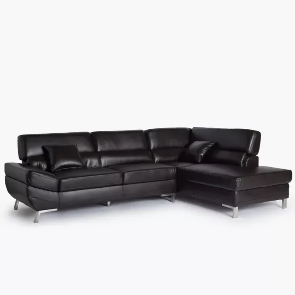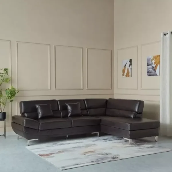 Experience luxury and comfort with this expansive L-shaped sectional sofa. Upholstered in premium brown Leather Rite, it offers the sophisticated look of leather with enhanced durability. The piece features contemporary silver metal legs and thick, padded cushions with adjustable headrests for personalized support. Its deep seating and Turkish-inspired silhouette make it the ultimate centerpiece for modern living rooms.