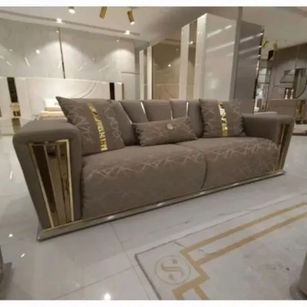 Elevate your living area with this Turkish-inspired luxury sofa. Wrapped in high-end beige velvet, the piece is defined by its striking gold-finish frame and armrest accents. The upholstery features a subtle geometric pattern, complemented by custom throw pillows that blend comfort with opulent design.