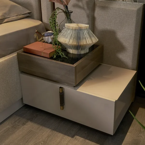 This Turkish-inspired master bedroom set defines luxury. The expansive headboard features plush fabric panels with gold accents, complemented by a matching vanity and ample storage space to create a cohesive, high-end sanctuary.