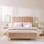 Create a serene retreat with the Valerius Classic Bed. This piece is upholstered in a soft beige Leather Rite fabric, featuring a gracefully curved headboard. The classic aesthetic is reinforced by fine detailing along the edges, making it an ideal centerpiece for a traditional or transitional master bedroom.