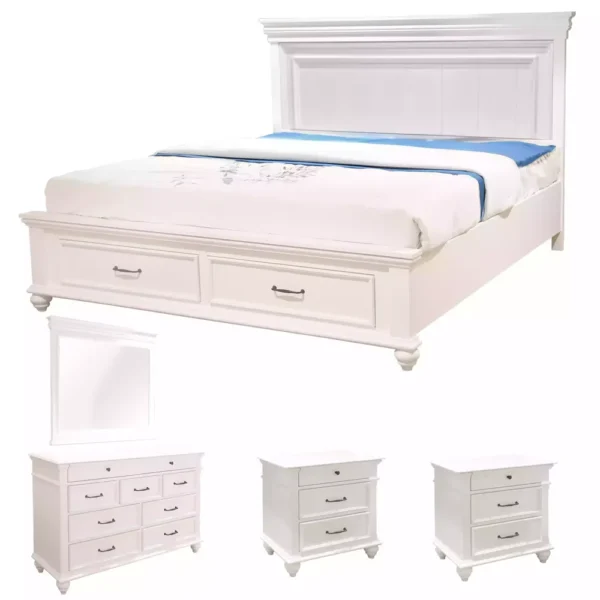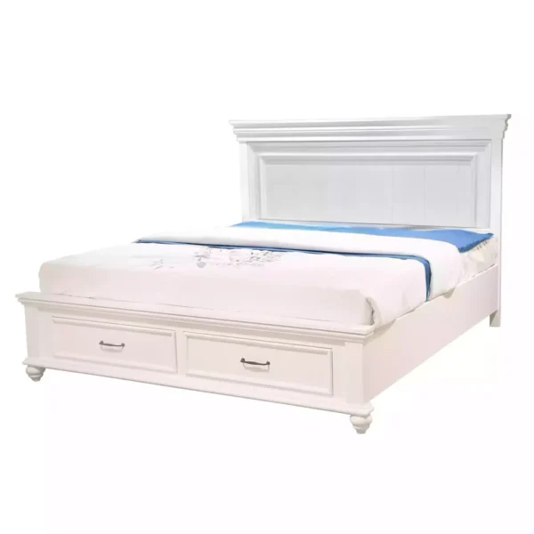Combining style with functionality, the Victoria Bed features a brilliant white deco finish that brightens any room. The highlight of this piece is the built-in storage drawers in the footboard, perfect for stowing away extra linens or clothing. Its classic paneling and robust silhouette offer a timeless look that fits various decor styles.