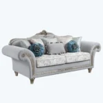 This Victorian-style sofa is the epitome of luxury. The frame is finished in a brilliant silver polish with intricate crown carvings. The sky blue velvet is paired with elegant floral patterns on the cushions, making it a regal centerpiece for a formal drawing room or luxury parlor.
